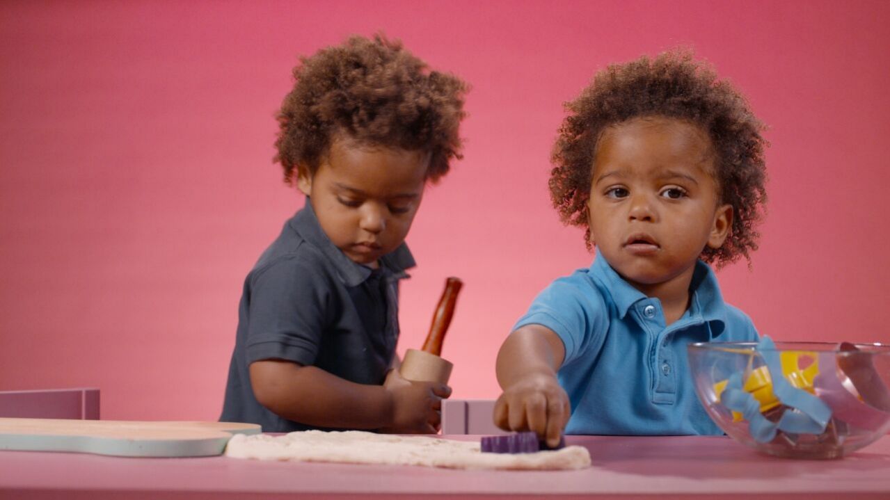 אמא ואני טי ומו עסוקים באפיה. אבל טי מתלכלך שוב ושוב ובכל פעם מו מנקה את פניו בעזרת מגבון פנים.